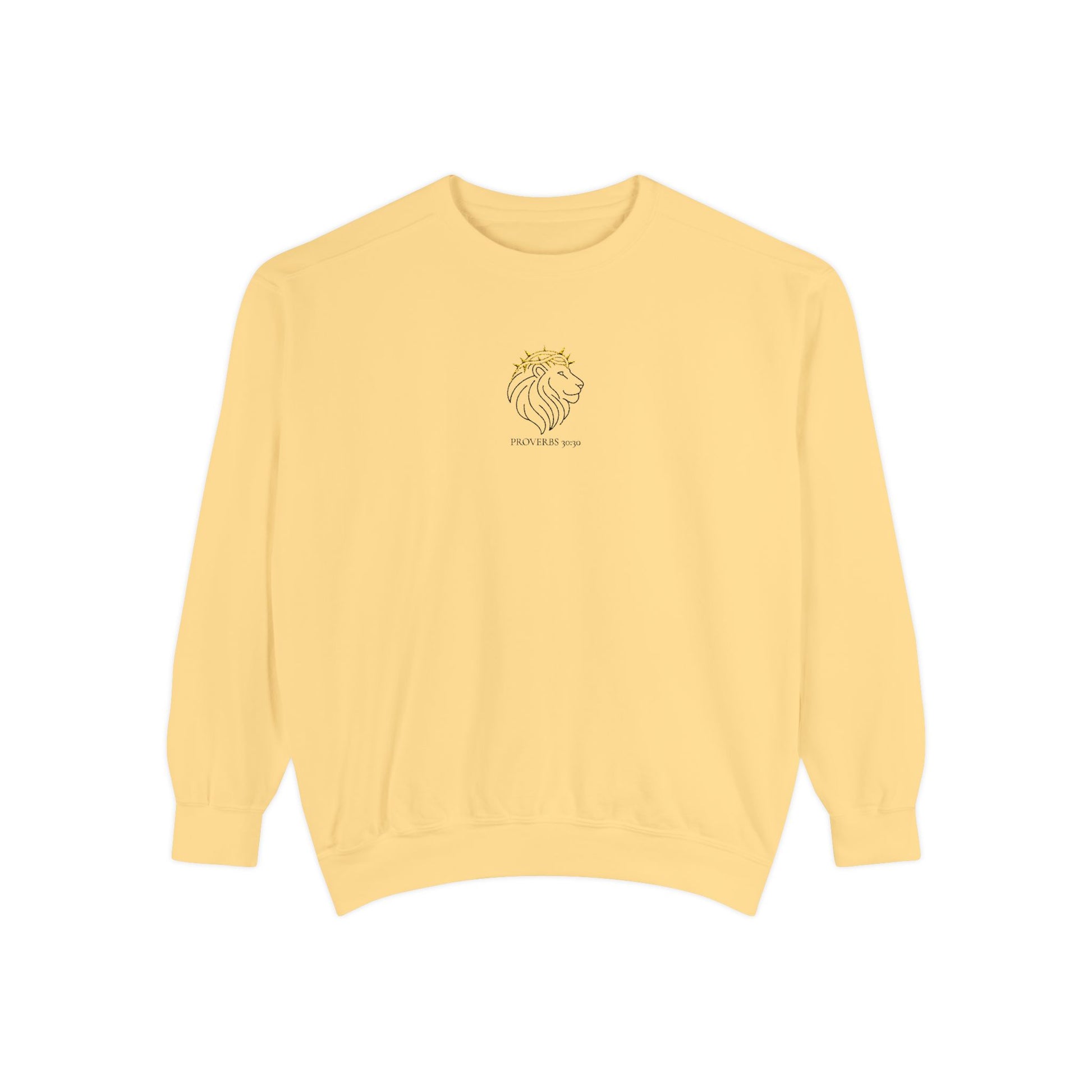 Wrap yourself in both comfort and courage with this Proverbs 30:30 crewneck sweatshirt. Featuring a powerful lion crowned in victory, this design draws inspiration from Scripture: “The lion, which is mightiest among beasts and does not turn back before any.”