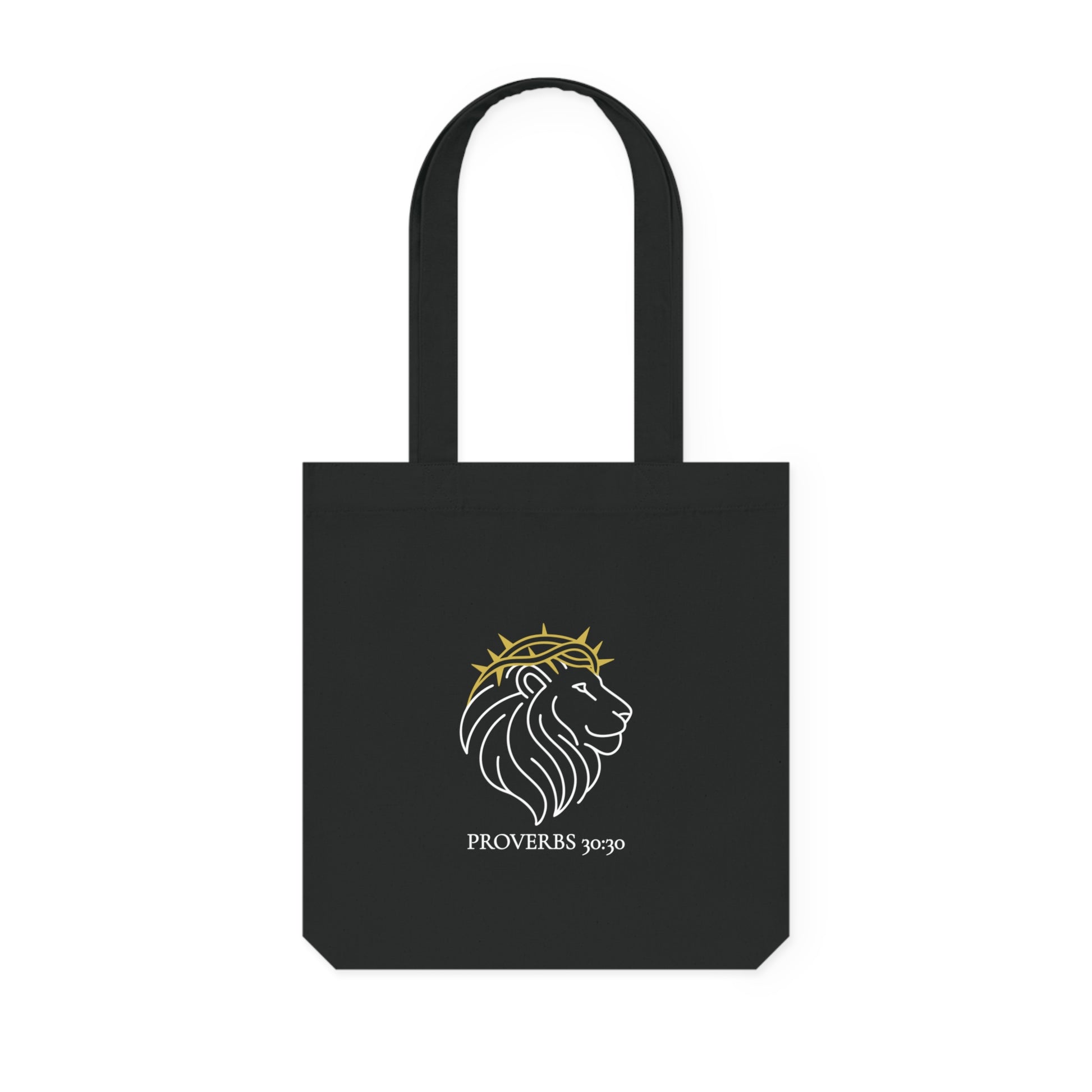 Carry your faith boldly with this beautifully designed tote bag featuring a majestic lion crowned in strength and dignity. Inspired by Proverbs 30:30 — “The lion, which is mightiest among beasts and does not turn back before any” — this bag is a daily reminder of courage, resilience, and unshakable faith.